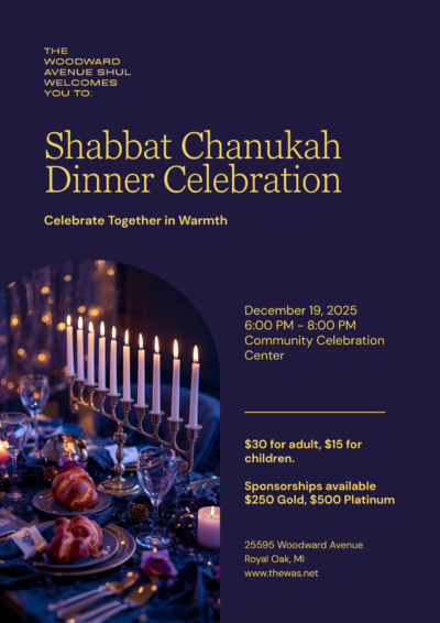 BBQ Shabbat Dinner - Lag Baomer themed Where: Woodward Avenue Shul When: Friday, May 16th at 7:00PM - Services followed by Dinner. Cost: $18 per person, sponsorships available at $180, $360! Please let us know that you plan to attend [...]