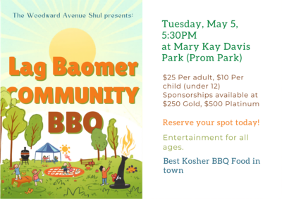 BBQ Shabbat Dinner - Lag Baomer themed Where: Woodward Avenue Shul When: Friday, May 16th at 7:00PM - Services followed by Dinner. Cost: $18 per person, sponsorships available at $180, $360! Please let us know that you plan to attend [...]
